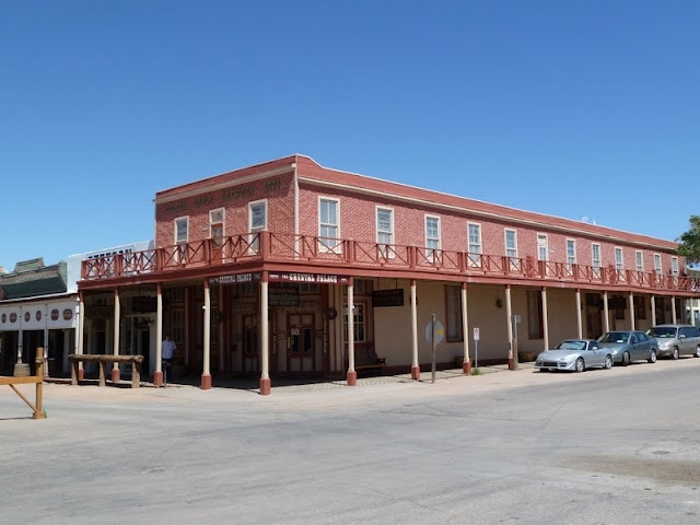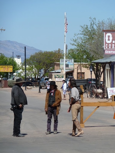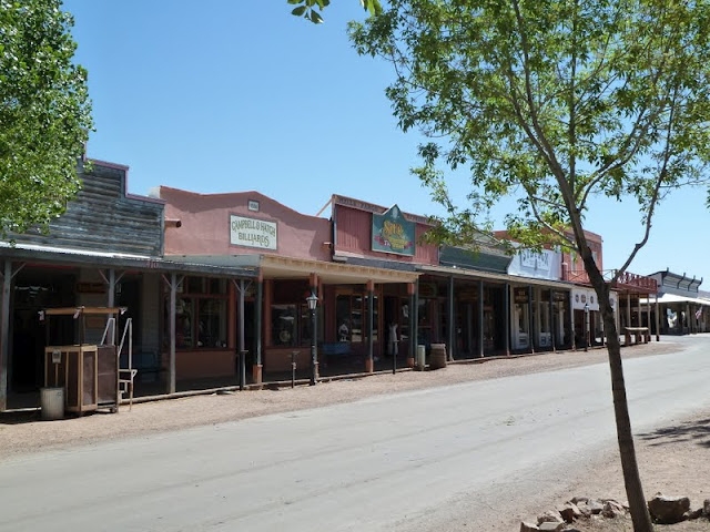 Je continue sur Tombstone. C’est une ville qui a connu un développement rapide et qui se vantait d’avoir déjà en 1881, un bowling, quatre églises, une école, deux banques, trois journaux et un salon de crème glacée, aux côtés de 110 salons, 14 salles de jeux et de nombreuses salles de danse. Virgil , Wyatt , Morgan et Warren Earp y arrivèrent en fin 1879 et occupèrent les places d’hommes de loi. Un conflit avec certains cow-boys se régla dans les rues de Tombstone en octobre 1881 connu sous le nom de Règlement de comptes à OK Corral. Les frères Earp ont eu la vie sauve et les cow-boys furent tués. Mais Virgil fut mutilé en décembre 1881 et son frère Morgan assassiné en mars 1882.
