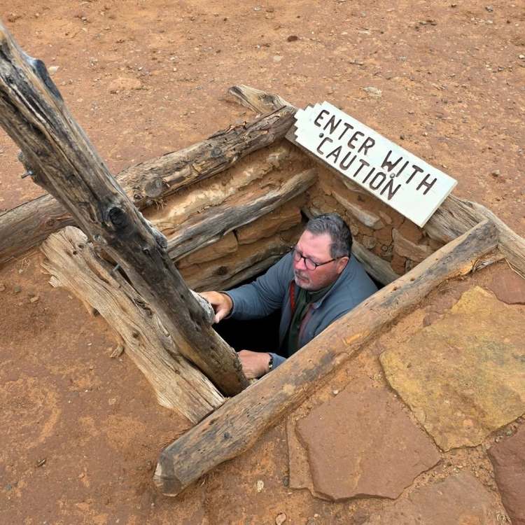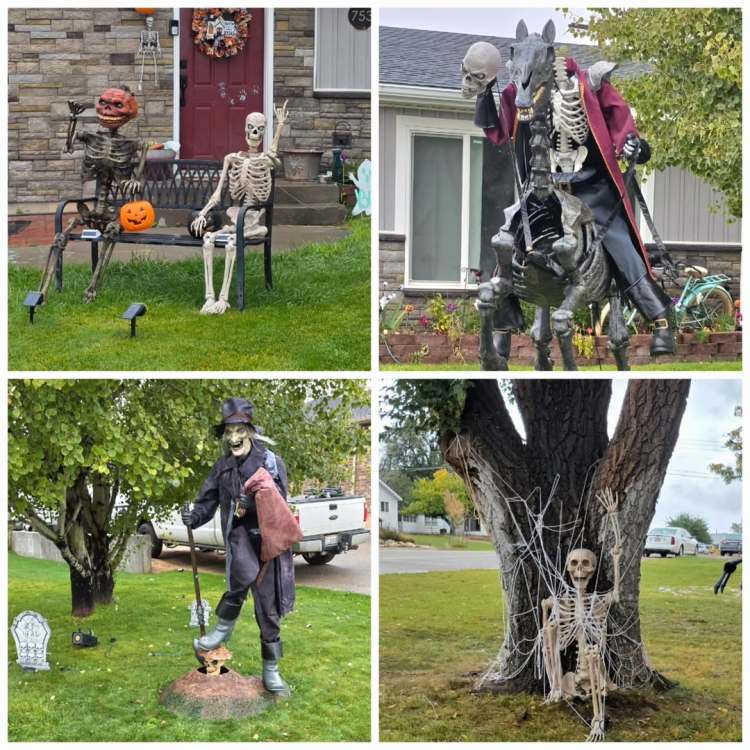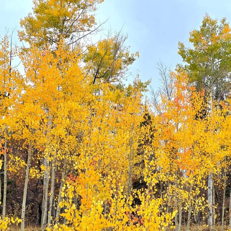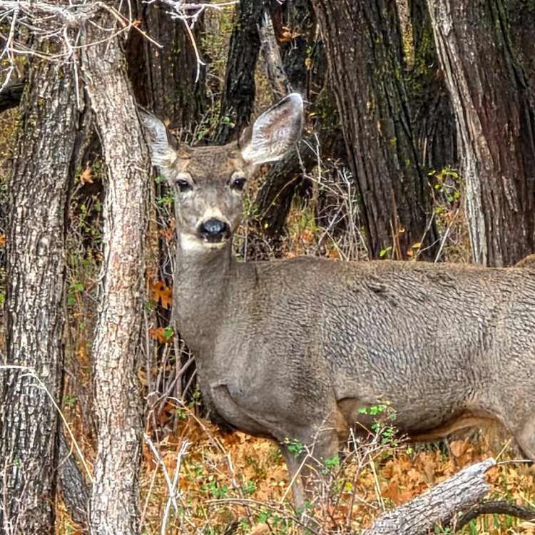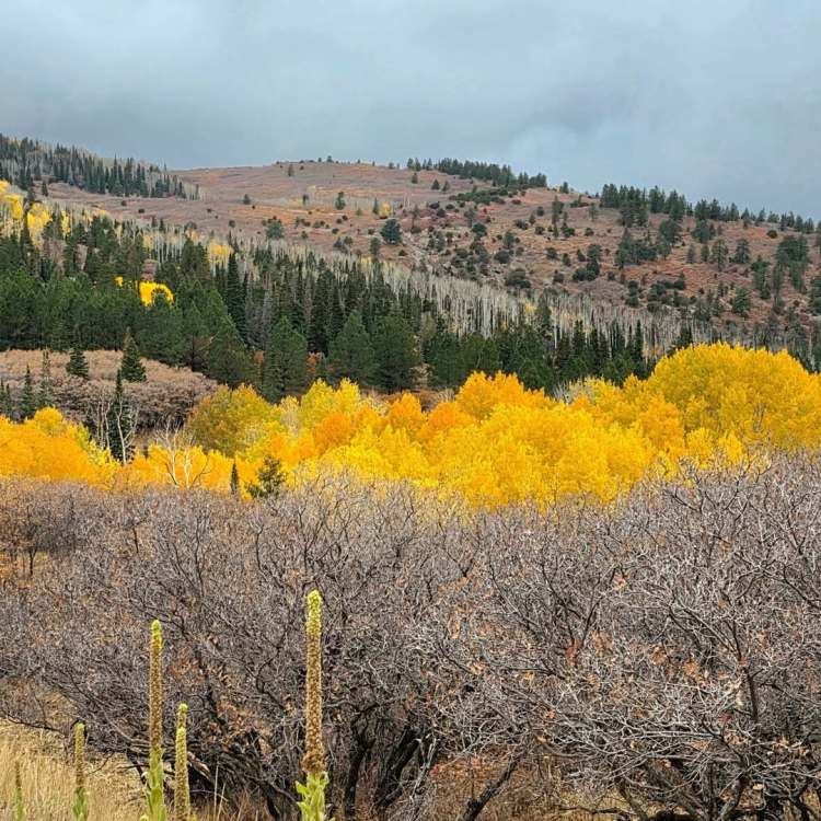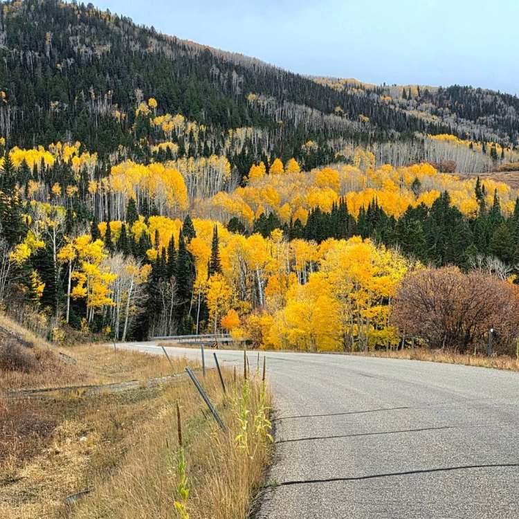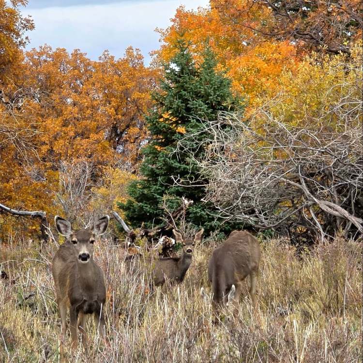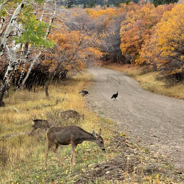 ut03 Il a plu cette nuit (incroyable) et c’est la grisaille ce matin. On va visiter le petit musée de Monticello, 1 ou 2 trading posts et le musée Edge à Blanding. Ça se découvre un peu et on part sur une route de montagne. Et là c’est incroyable… On doit éviter les biches par dizaines qui traversent la route, les dindons se baladent comme ils veulent. On s’arrête pour les observer et ils sont juste curieux de voir qui s’intéresse à eux. Superbes couleurs d’automne et faune géniale. Les décorations d’Halloween commencent à garnir les jardins.